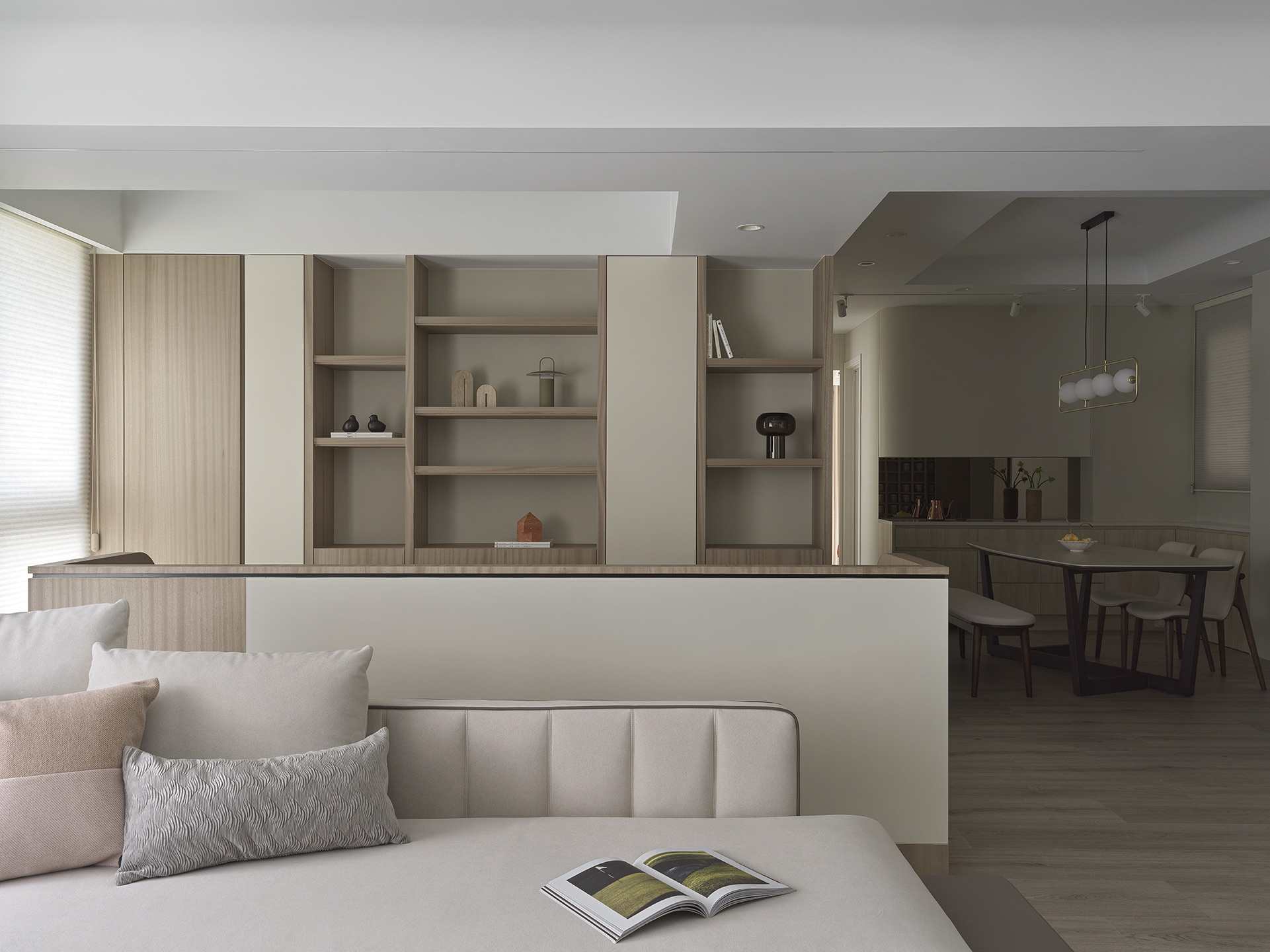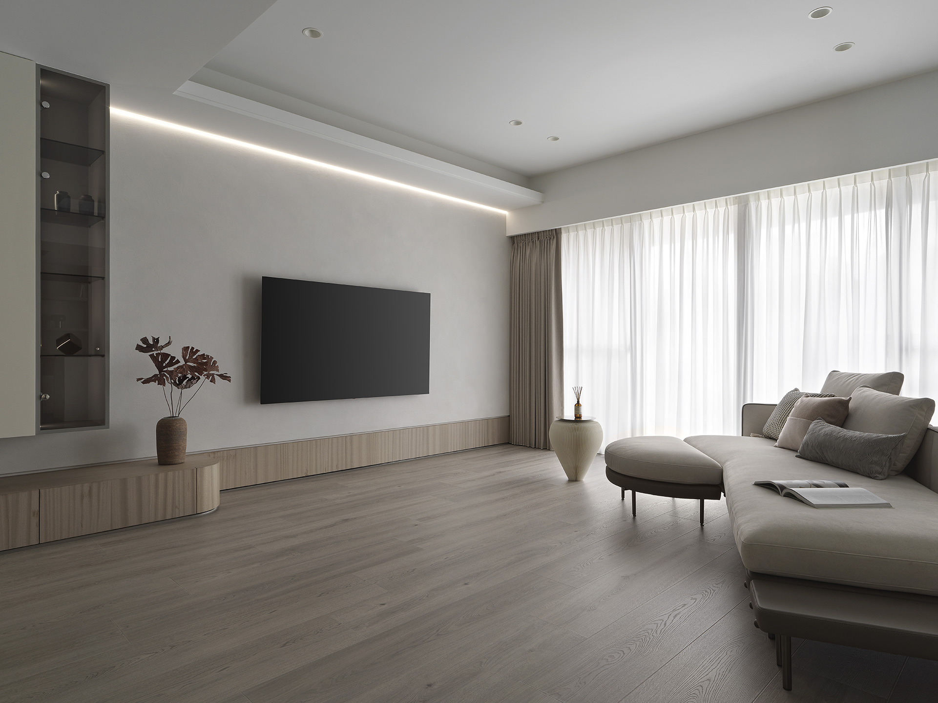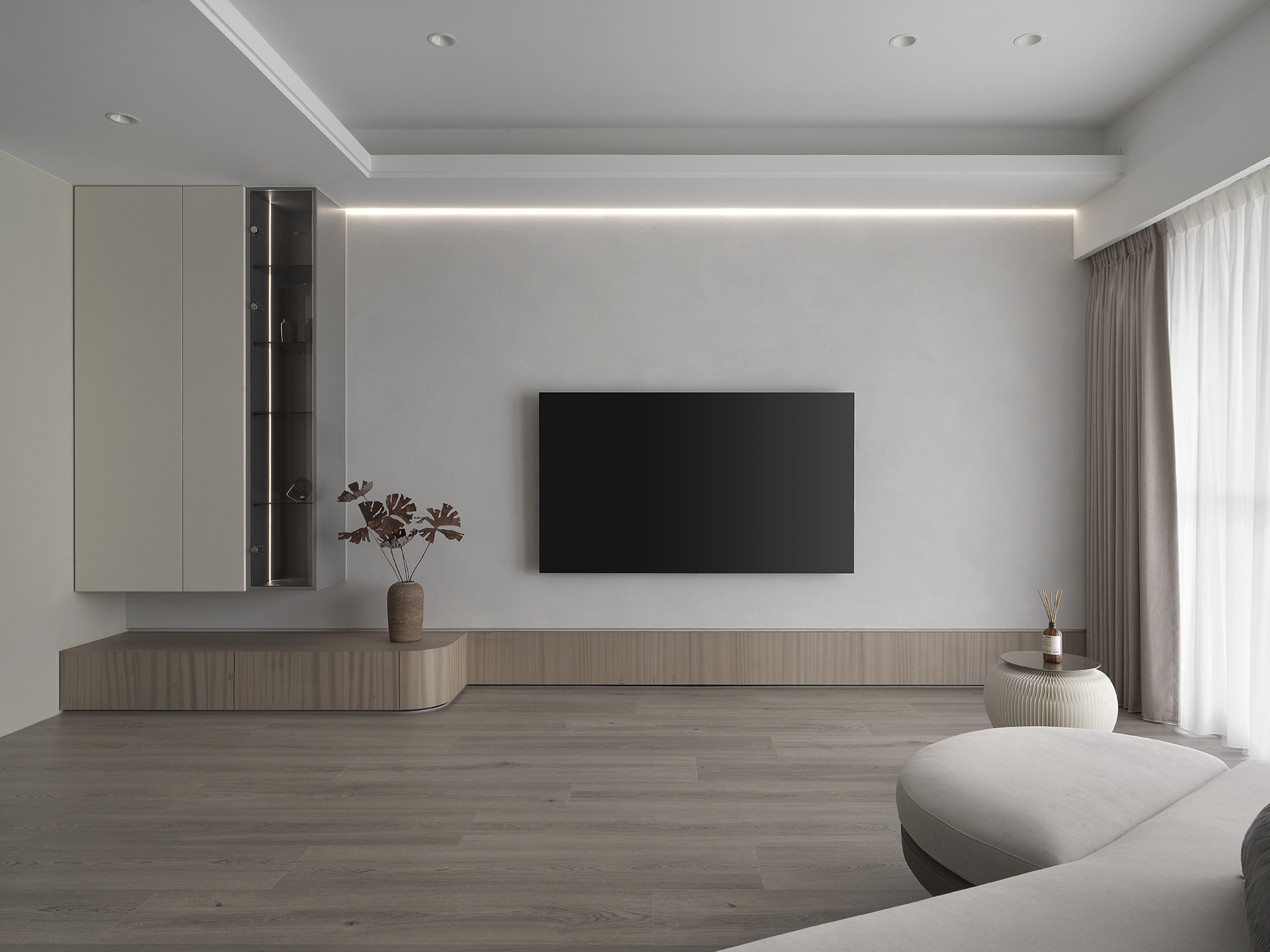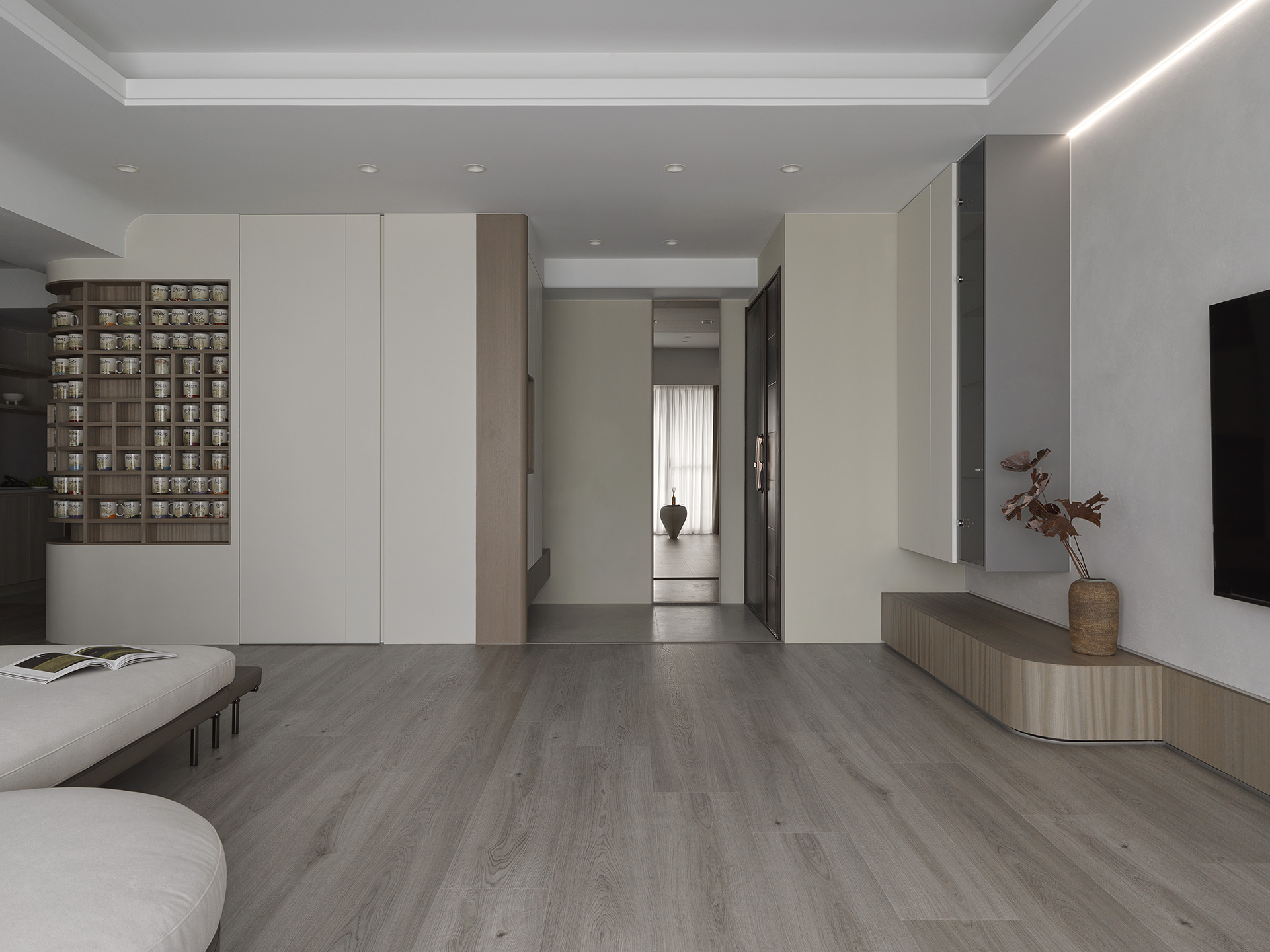 為了突顯這面世界風景圖,空間以米白與淺木色為基底,訴求乾淨溫和,只將繽紛留給這面牆。保留開闊的尺度,光帶沿著量體邊緣滑行,包含電視牆與低檯度的木平台橫向延伸、閱讀臥榻區後方的展示櫃、天花板起伏落差間,猶如在每個完成項目中畫上重點,讓空間在微光之中形成柔和的層次。