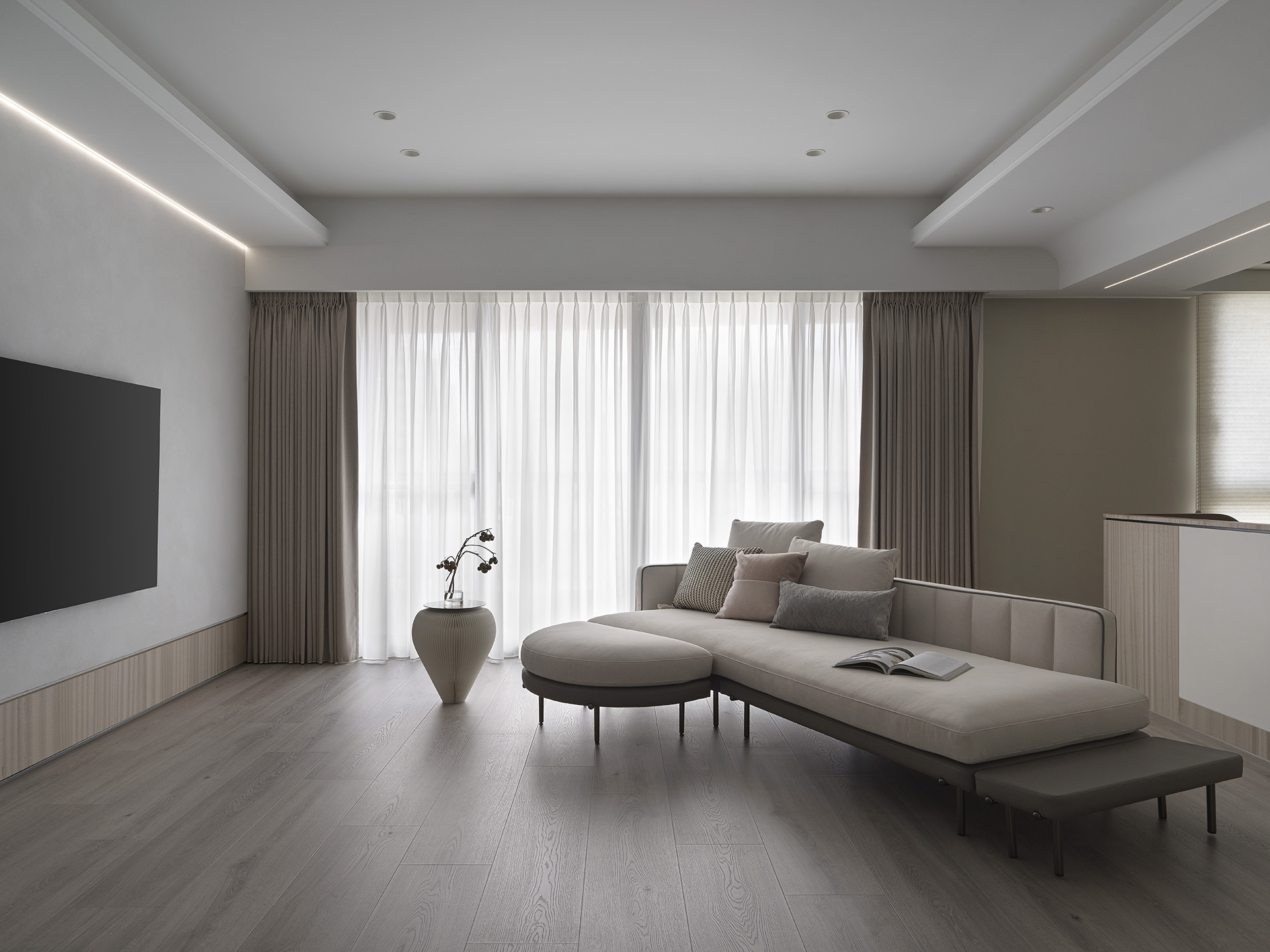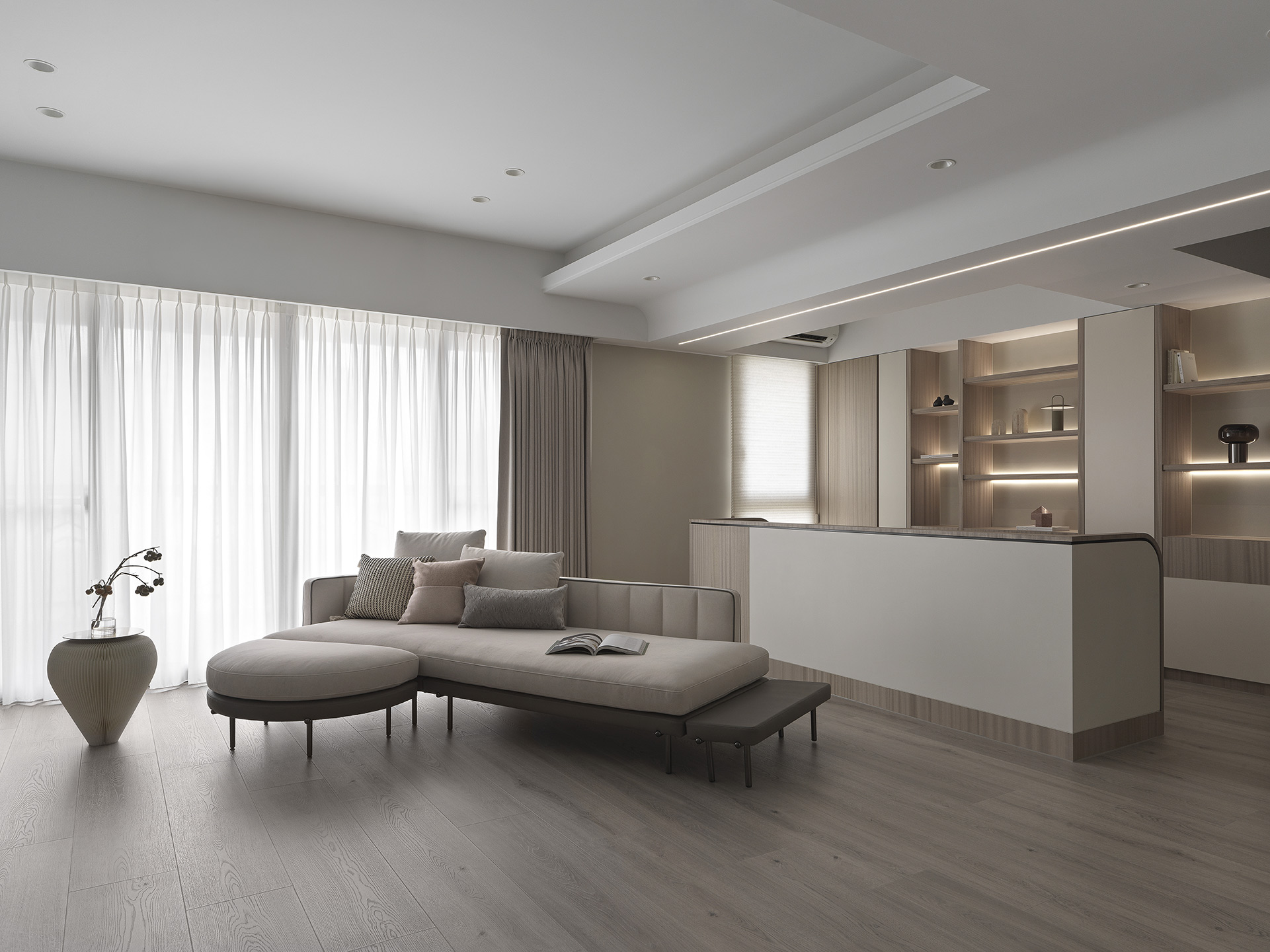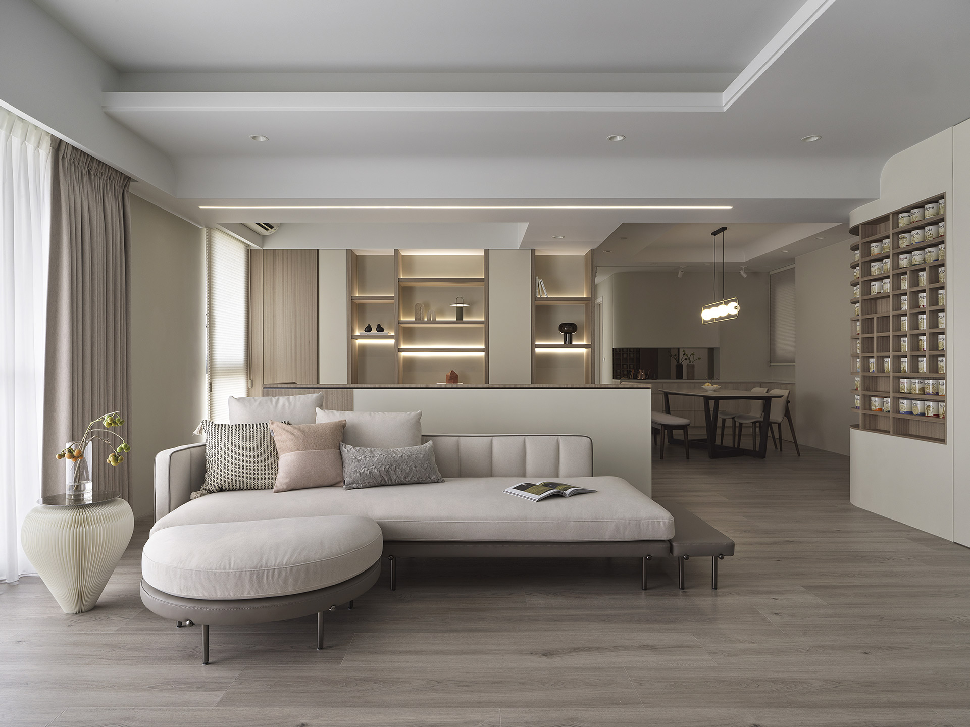 為了突顯這面世界風景圖,空間以米白與淺木色為基底,訴求乾淨溫和,只將繽紛留給這面牆。保留開闊的尺度,光帶沿著量體邊緣滑行,包含電視牆與低檯度的木平台橫向延伸、閱讀臥榻區後方的展示櫃、天花板起伏落差間,猶如在每個完成項目中畫上重點,讓空間在微光之中形成柔和的層次。