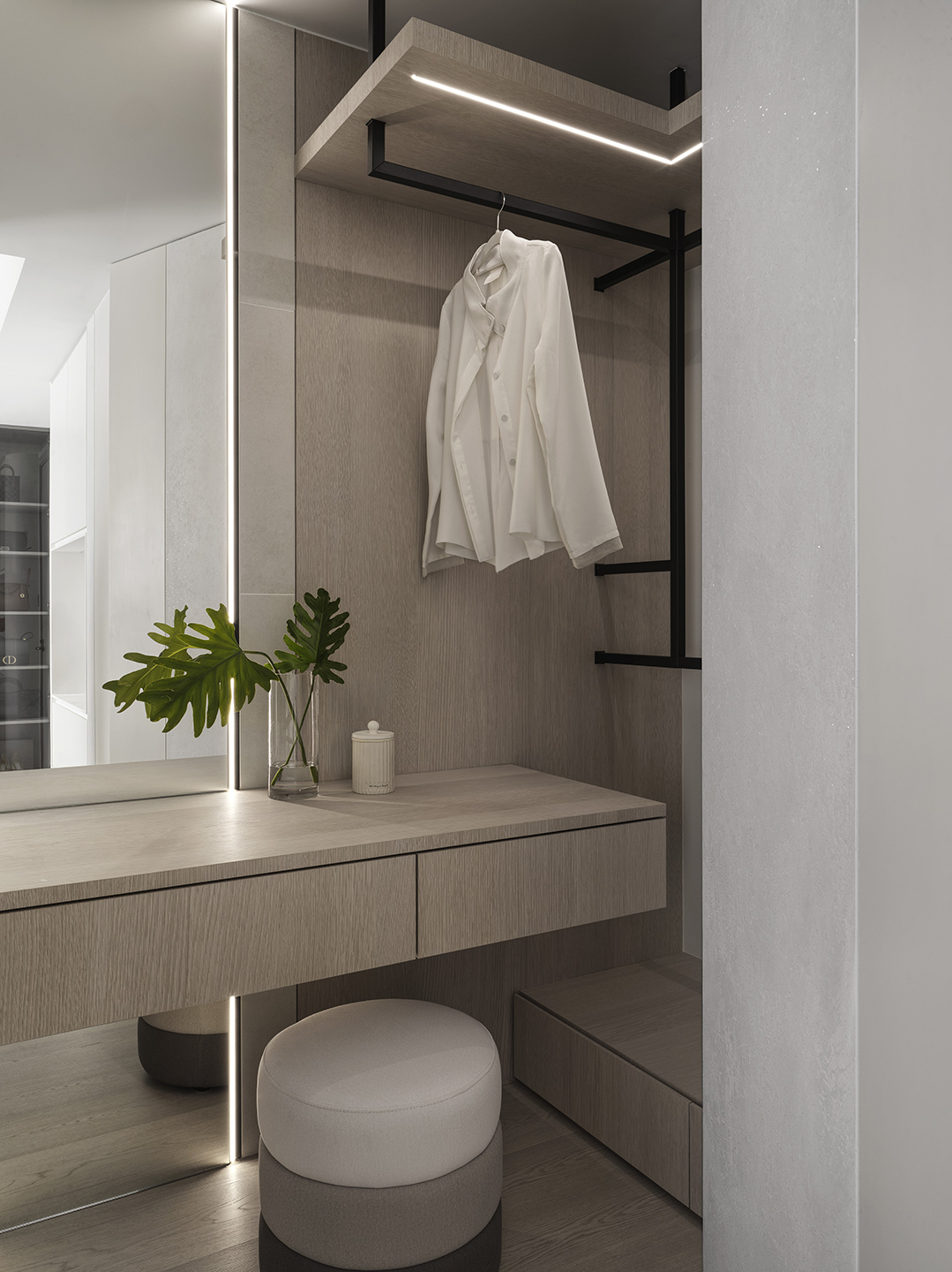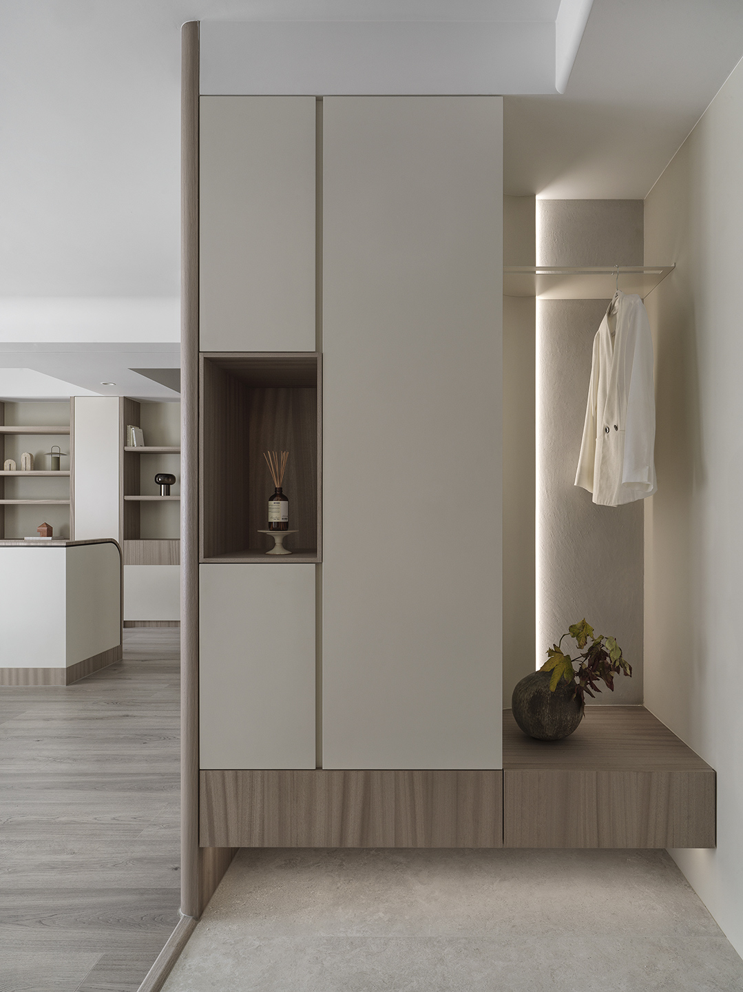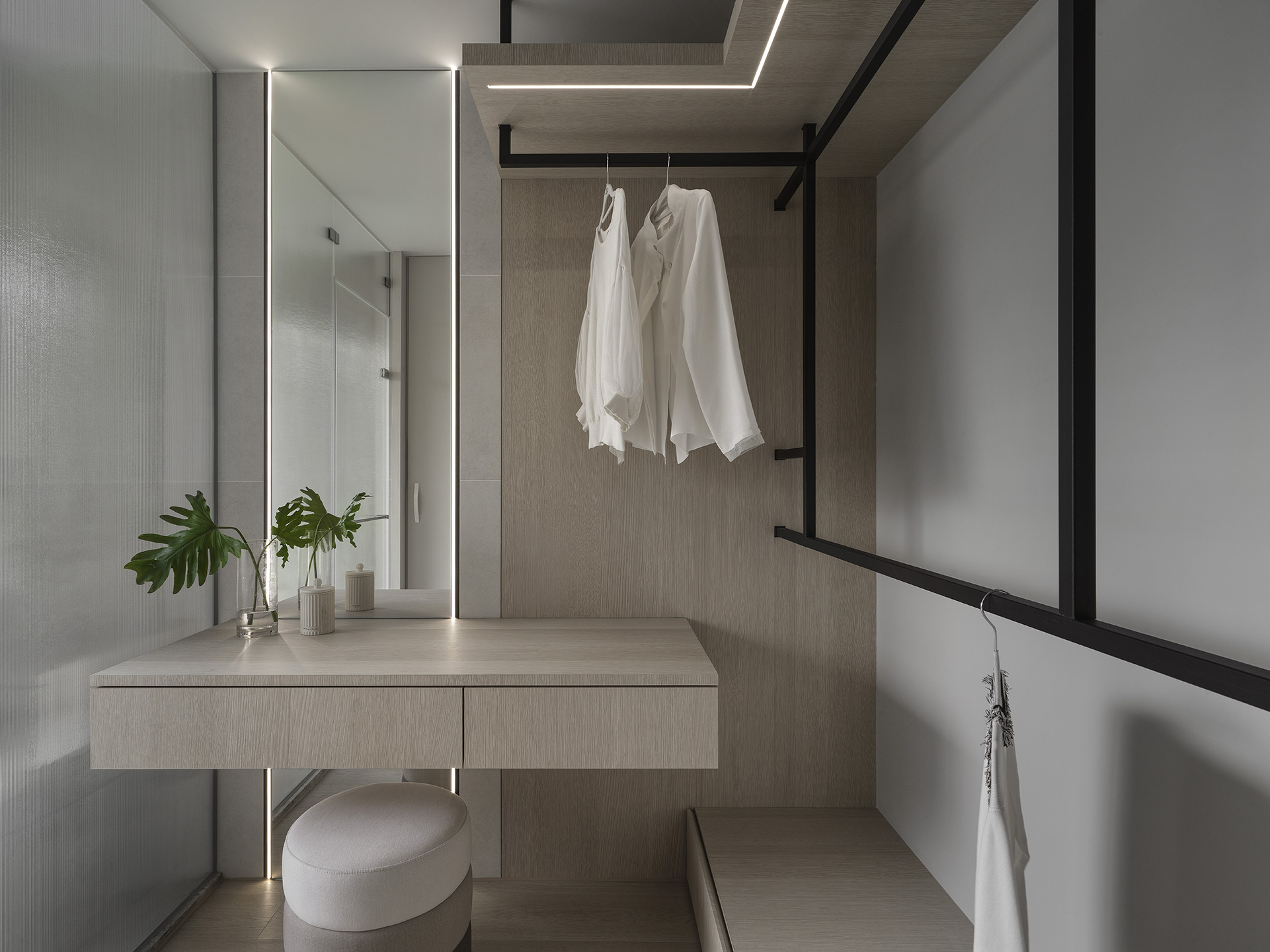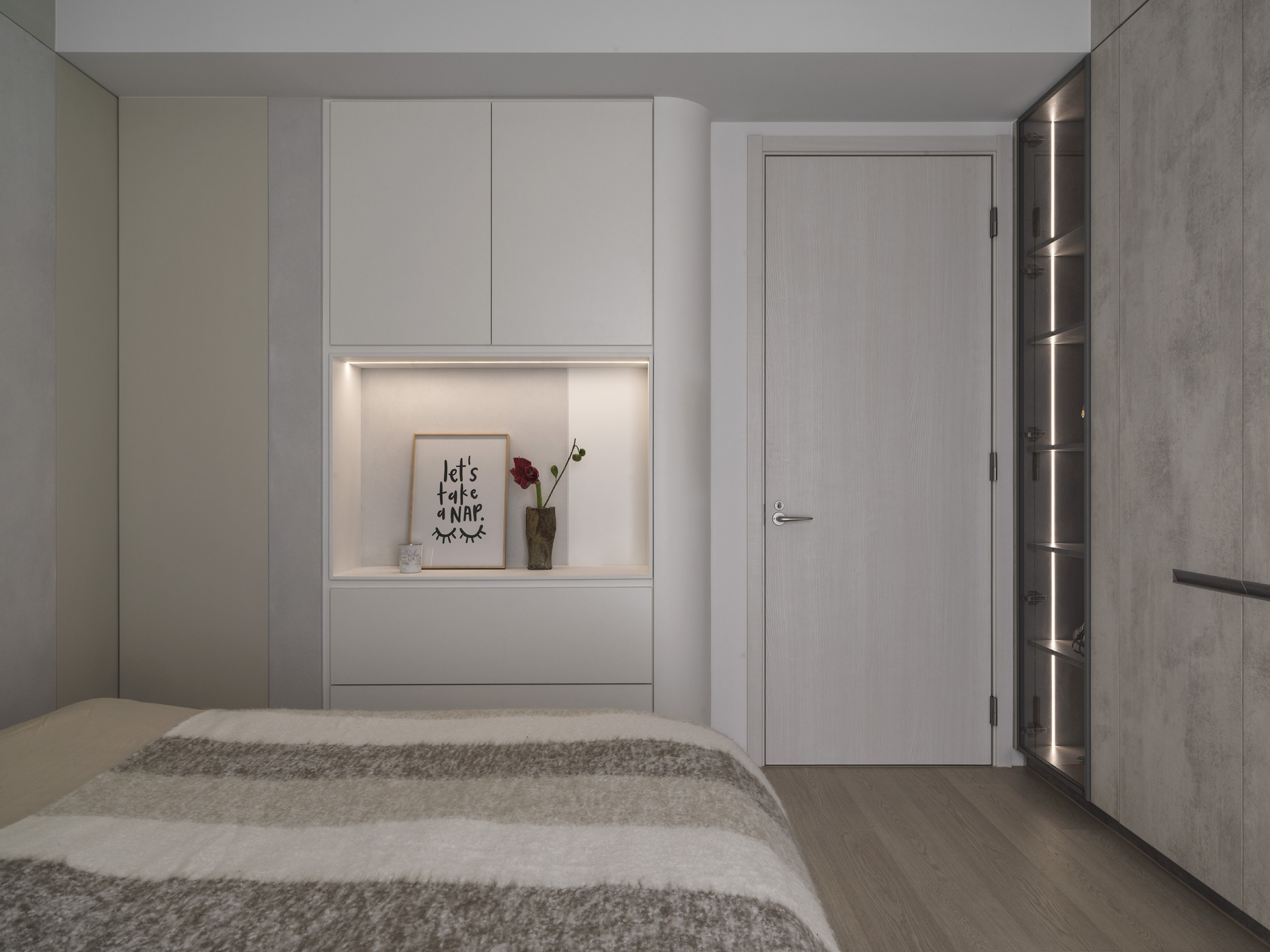 為了突顯這面世界風景圖,空間以米白與淺木色為基底,訴求乾淨溫和,只將繽紛留給這面牆。保留開闊的尺度,光帶沿著量體邊緣滑行,包含電視牆與低檯度的木平台橫向延伸、閱讀臥榻區後方的展示櫃、天花板起伏落差間,猶如在每個完成項目中畫上重點,讓空間在微光之中形成柔和的層次。