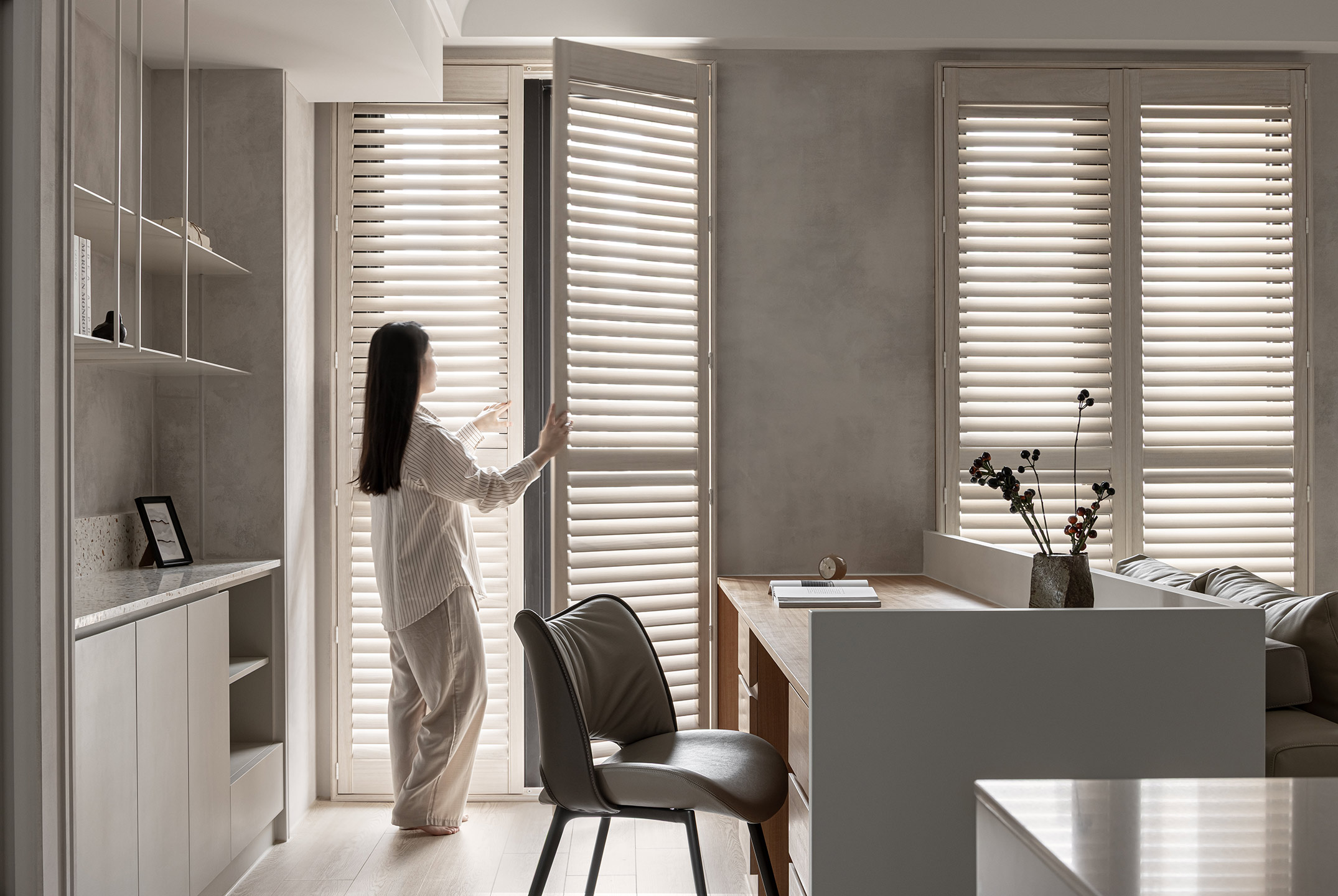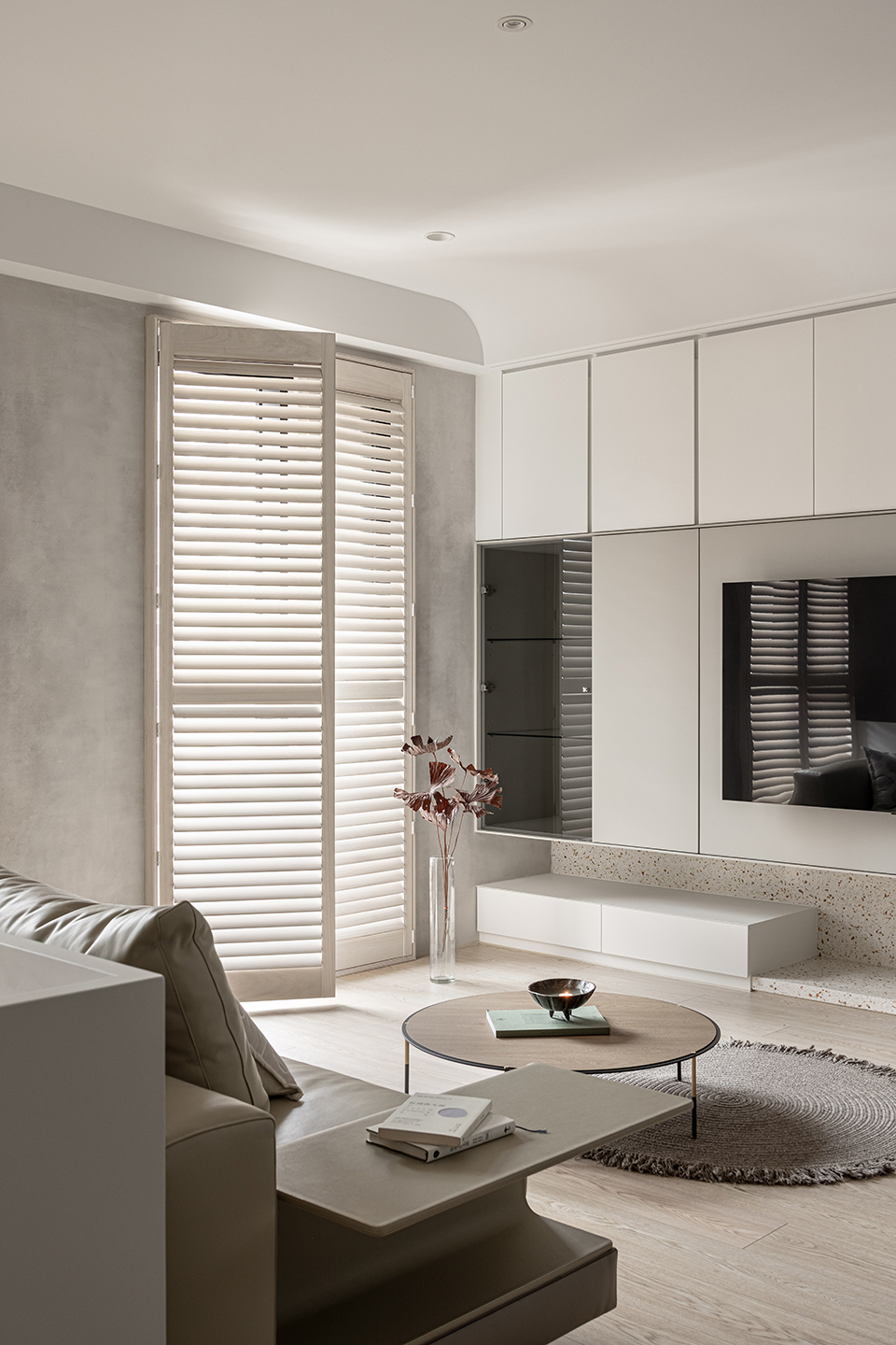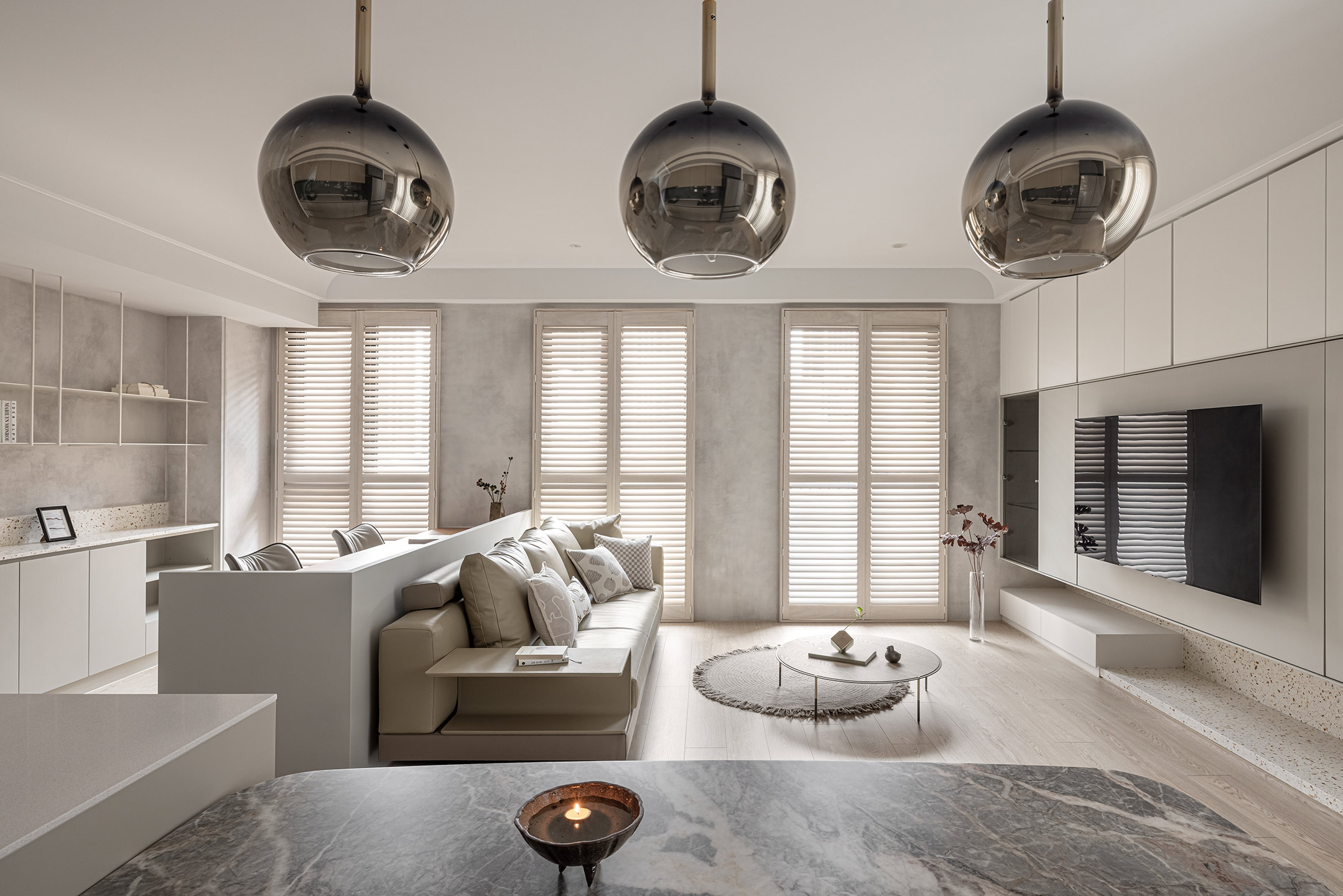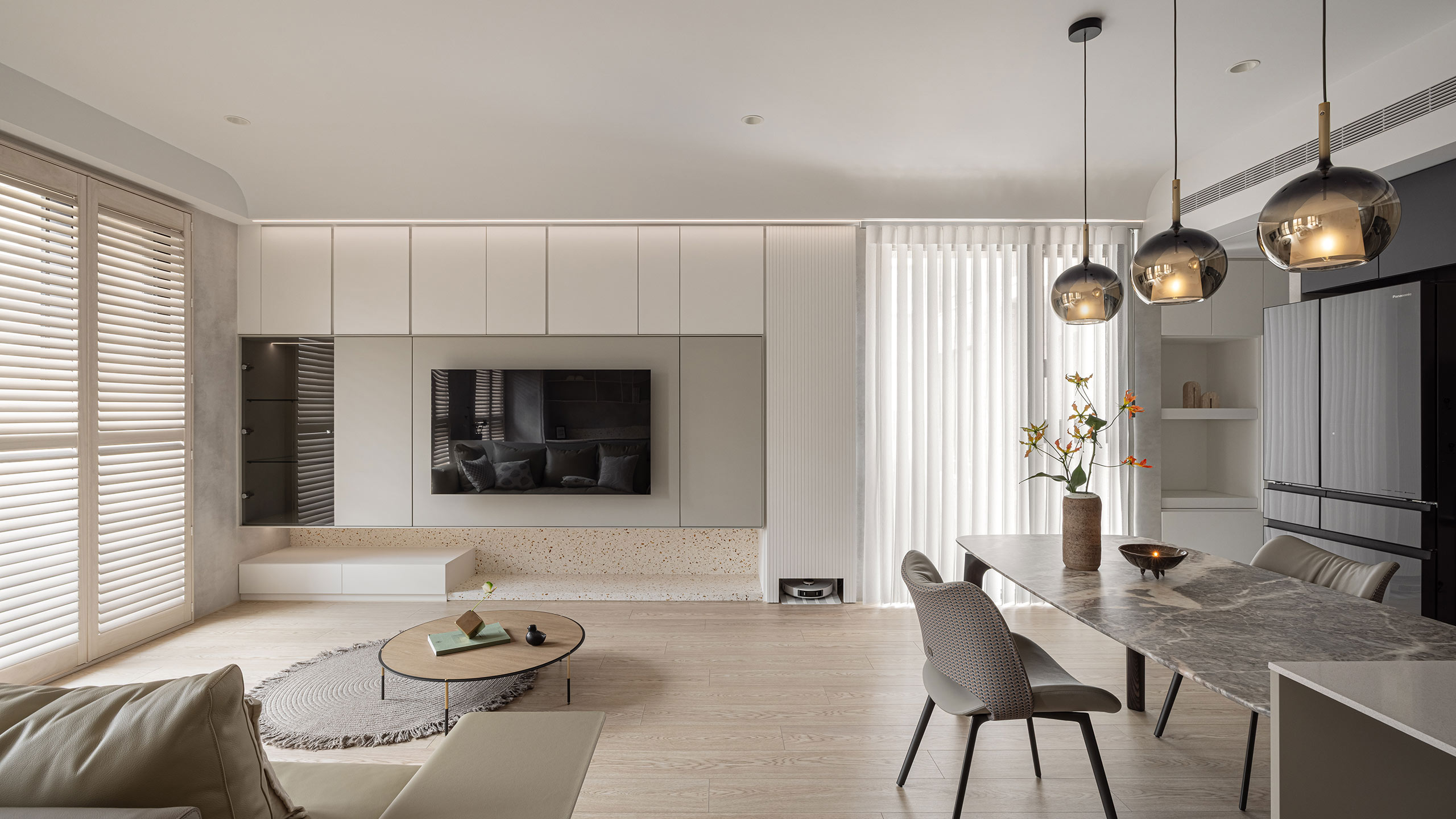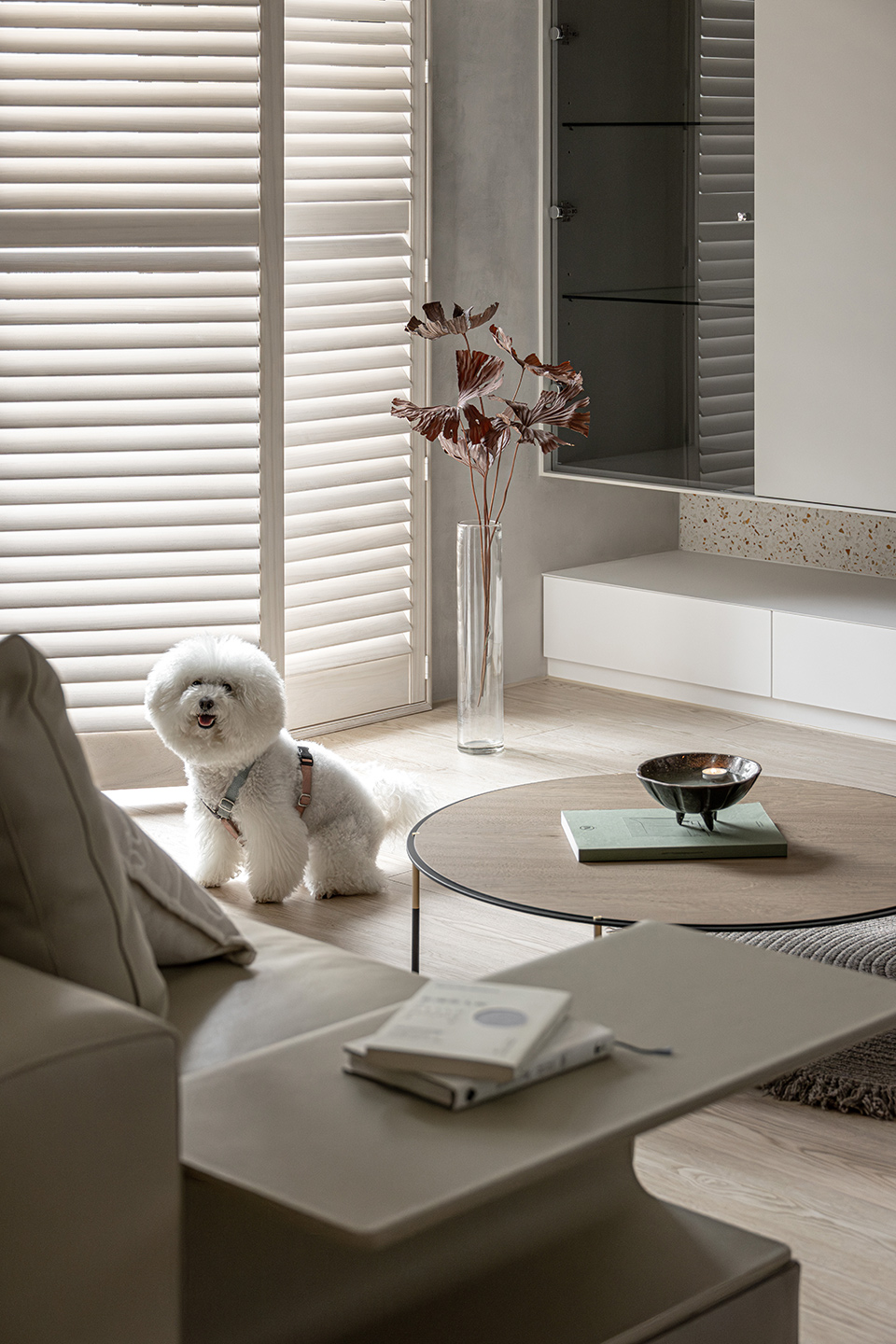 空間以低彩、乾淨的線條鋪陳。整排落地窗用百葉輕柔遮擋陽台,光線像一道道流動的薄紗,灑在木地板上,也剛好成了家中狗狗最愛打盹的午後角落。
