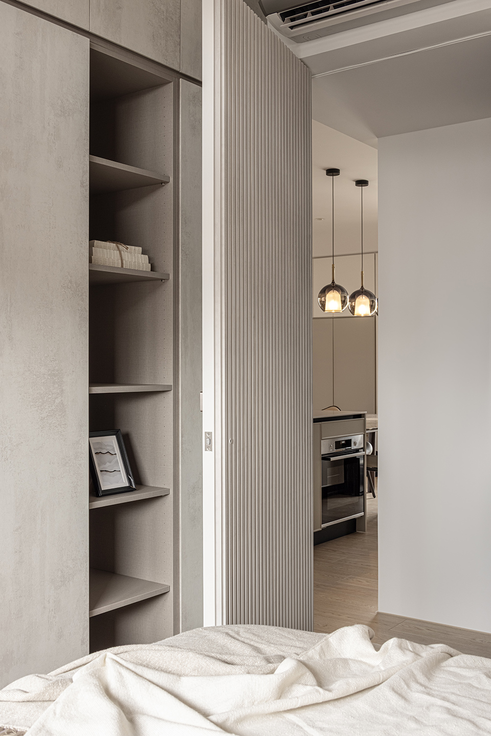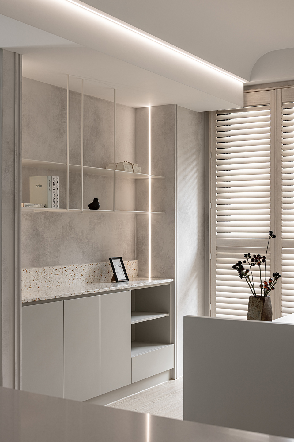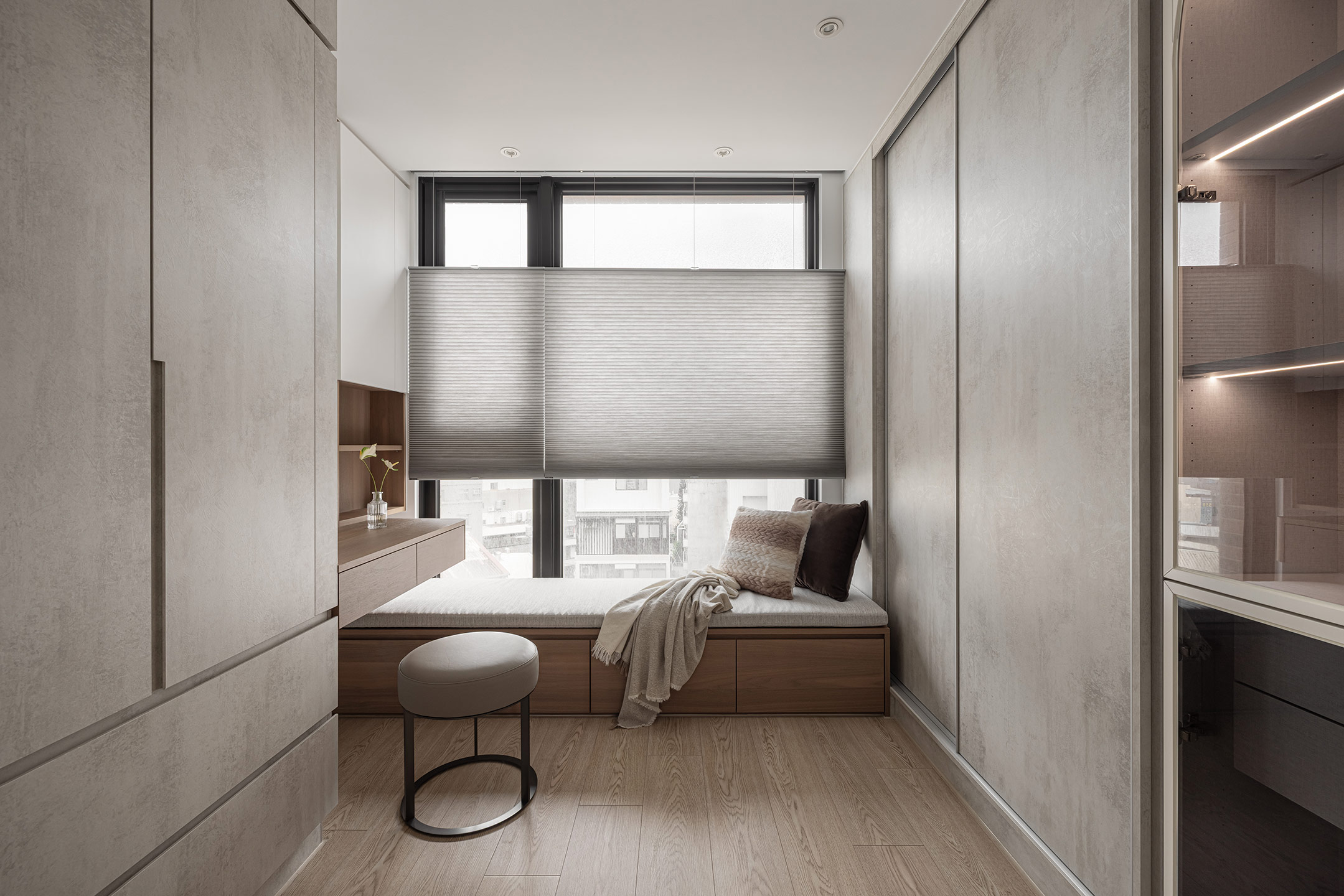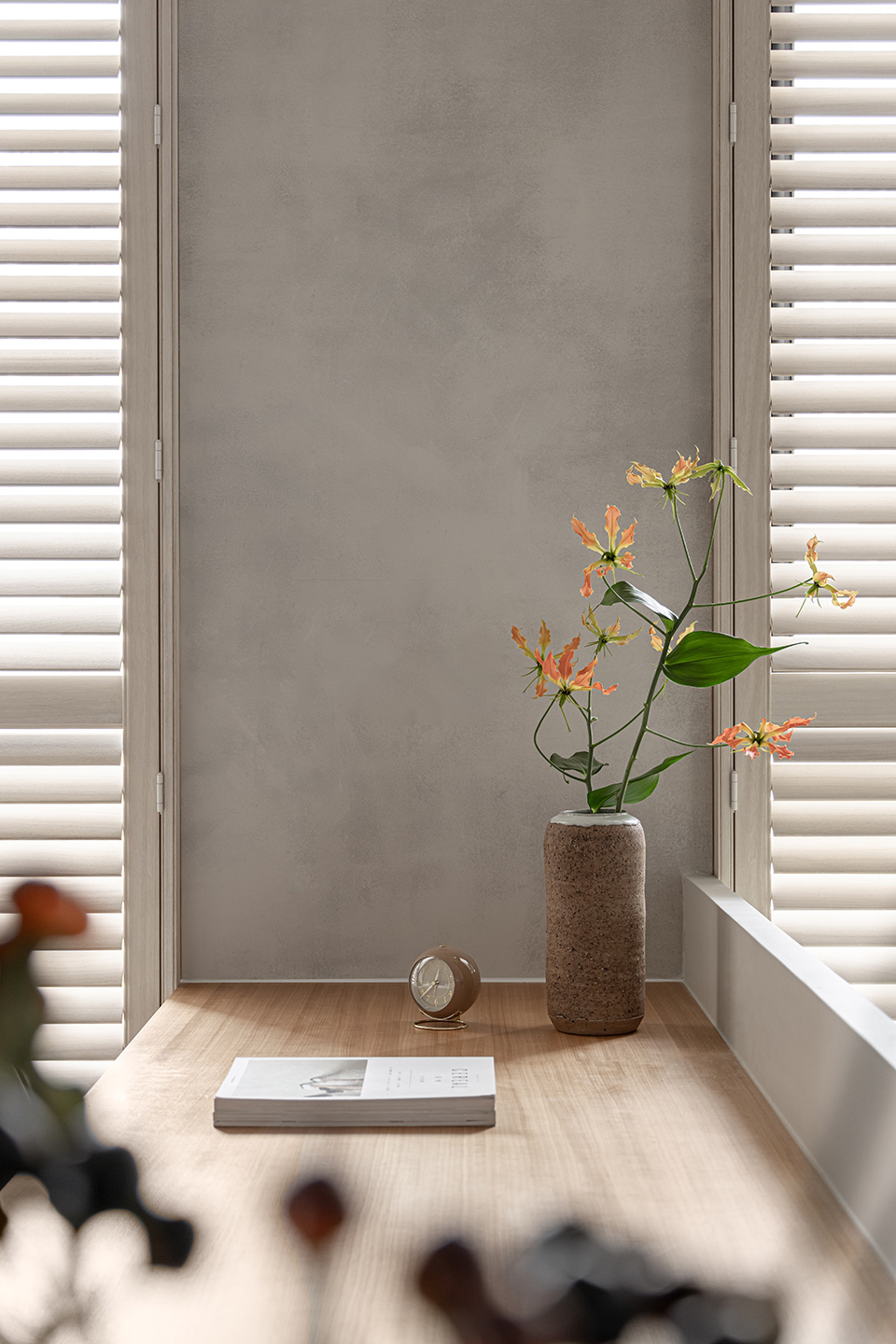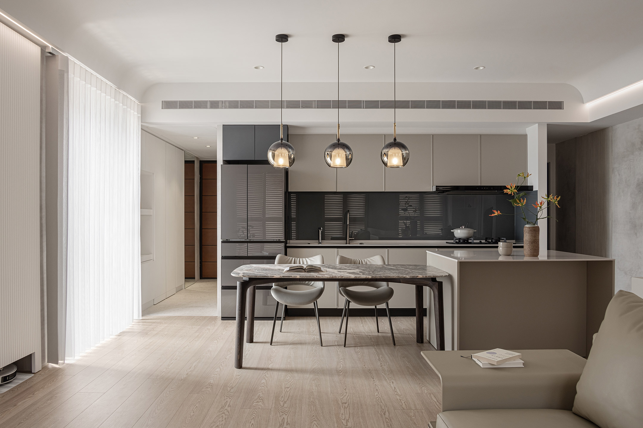空間以低彩、乾淨的線條鋪陳。整排落地窗用百葉輕柔遮擋陽台,光線像一道道流動的薄紗,灑在木地板上,也剛好成了家中狗狗最愛打盹的午後角落。