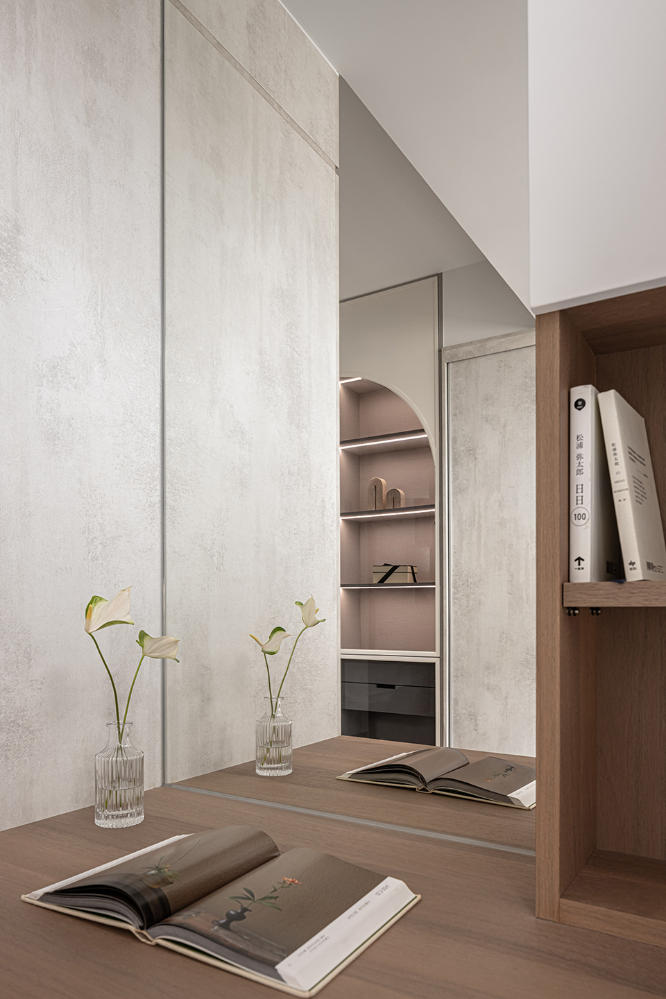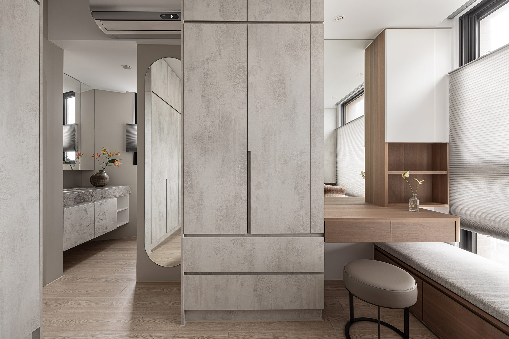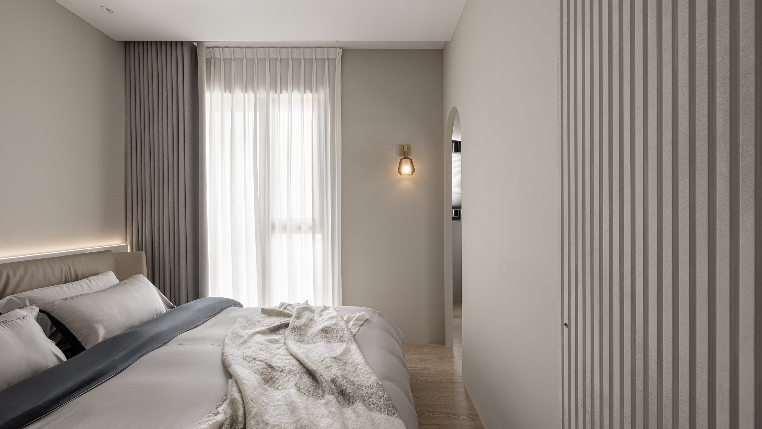 天花以圓角收邊,讓結構轉折變得柔和;沙發與櫃體自然嵌合,順勢劃出工作區與起居區的界線,沒有刻意強調分野,卻讓空間運作起來分明有序。