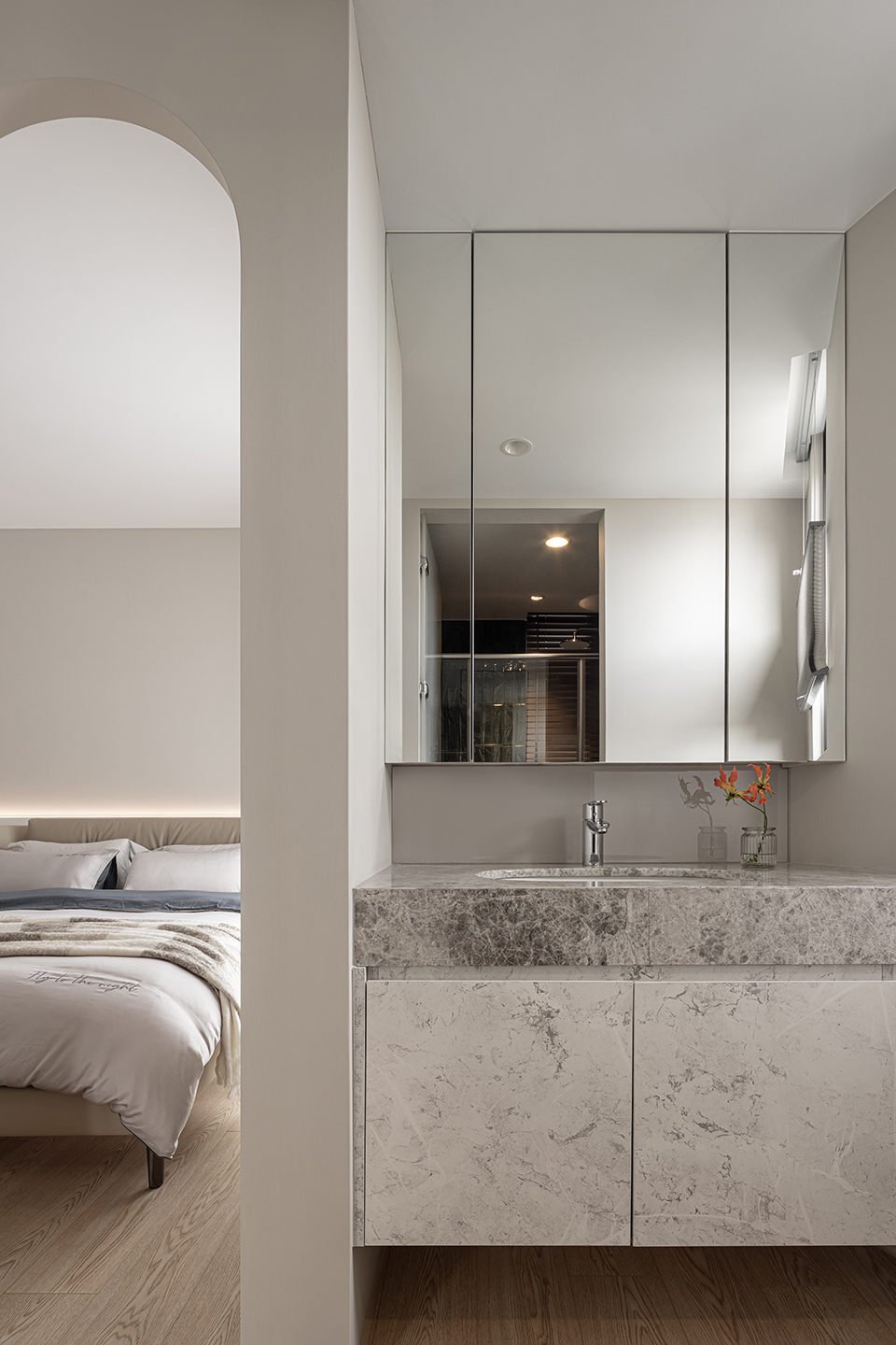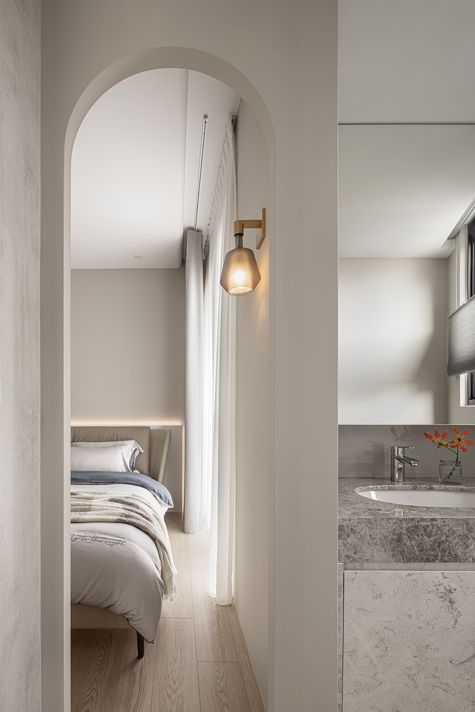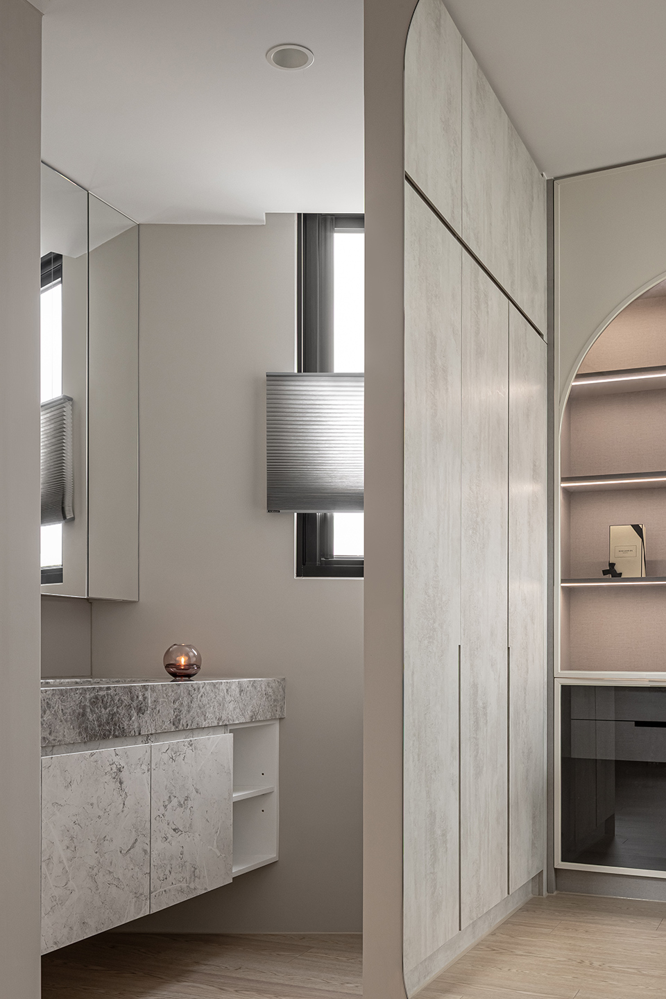 天花以圓角收邊,讓結構轉折變得柔和;沙發與櫃體自然嵌合,順勢劃出工作區與起居區的界線,沒有刻意強調分野,卻讓空間運作起來分明有序。