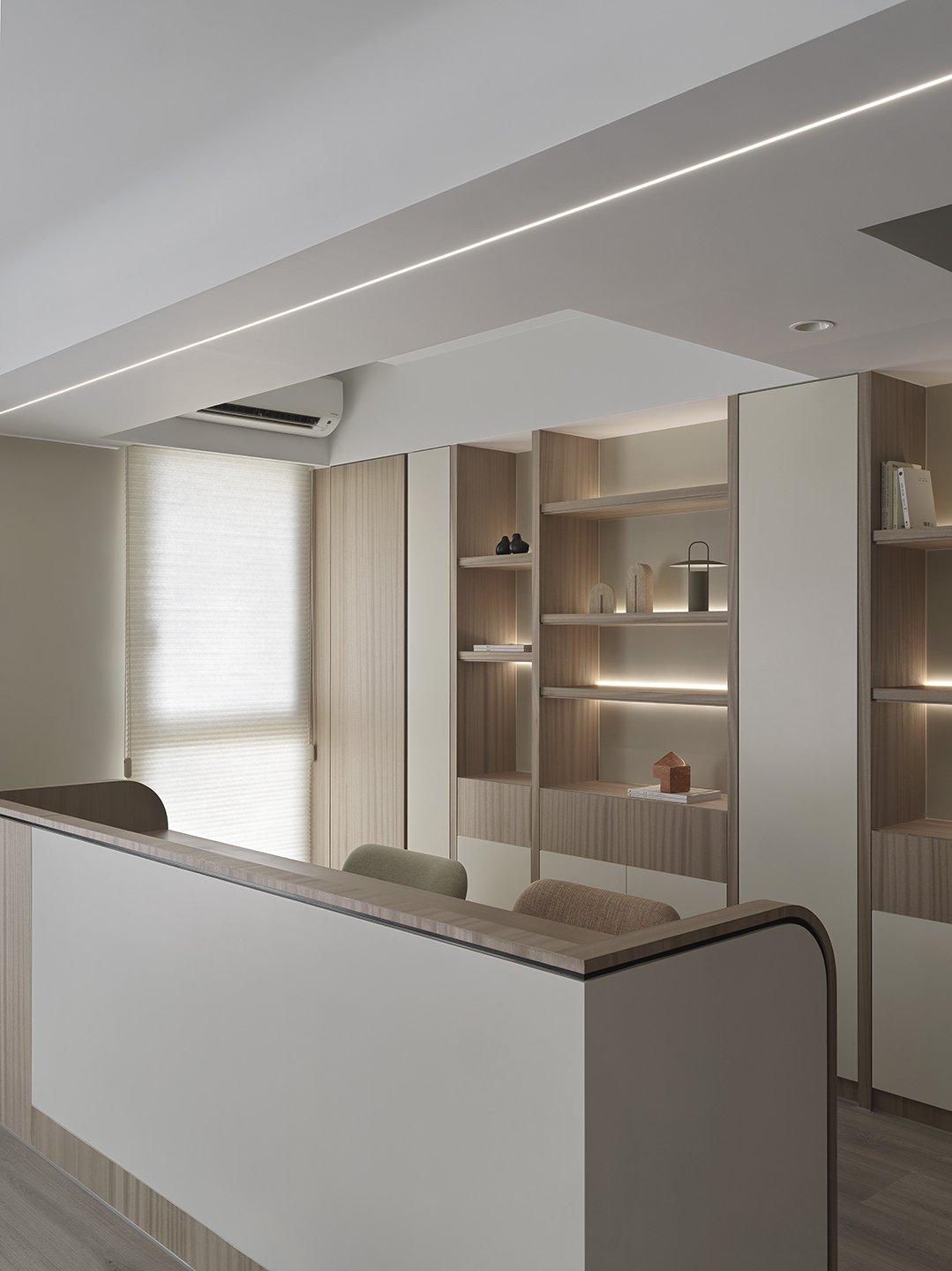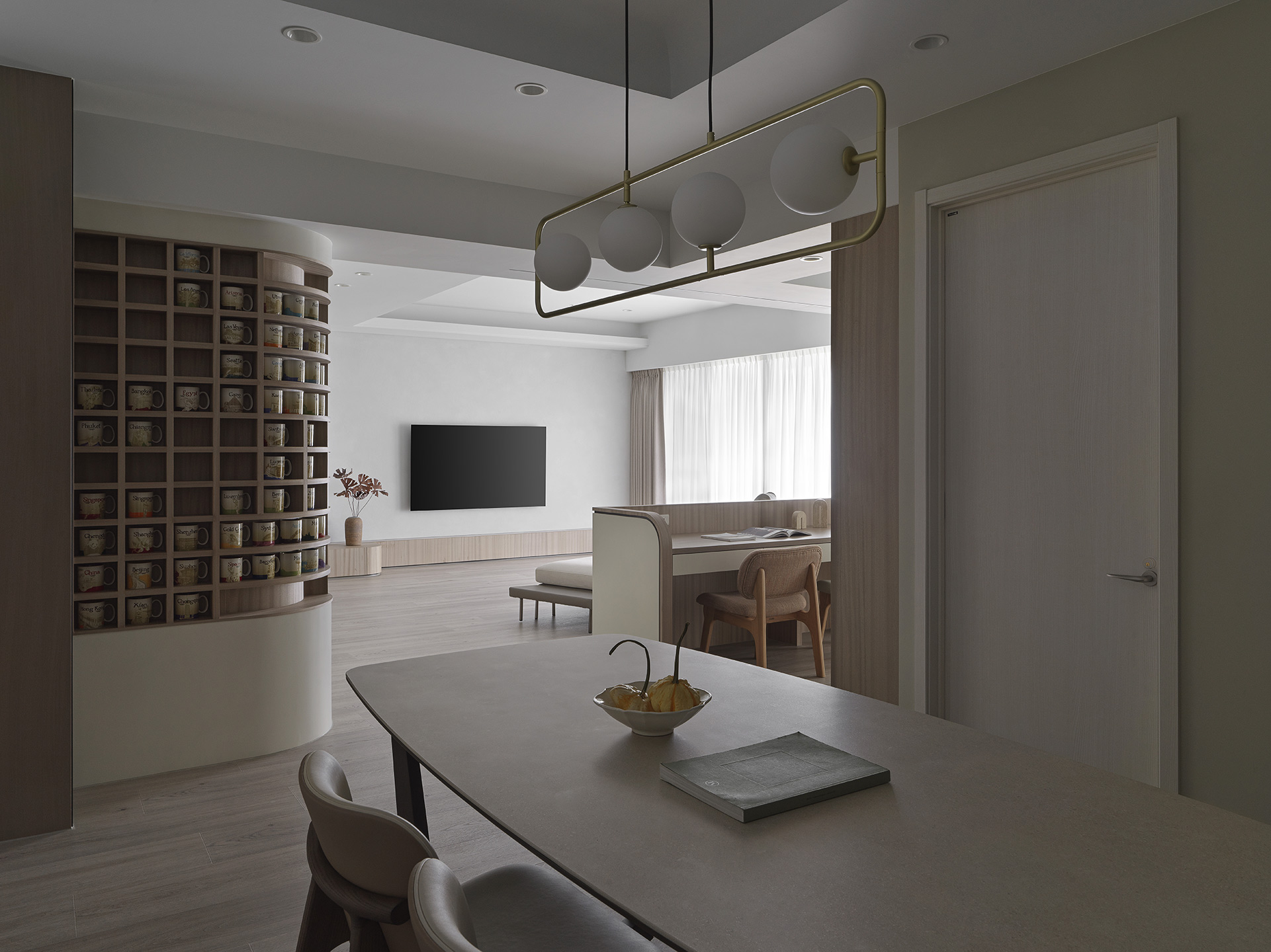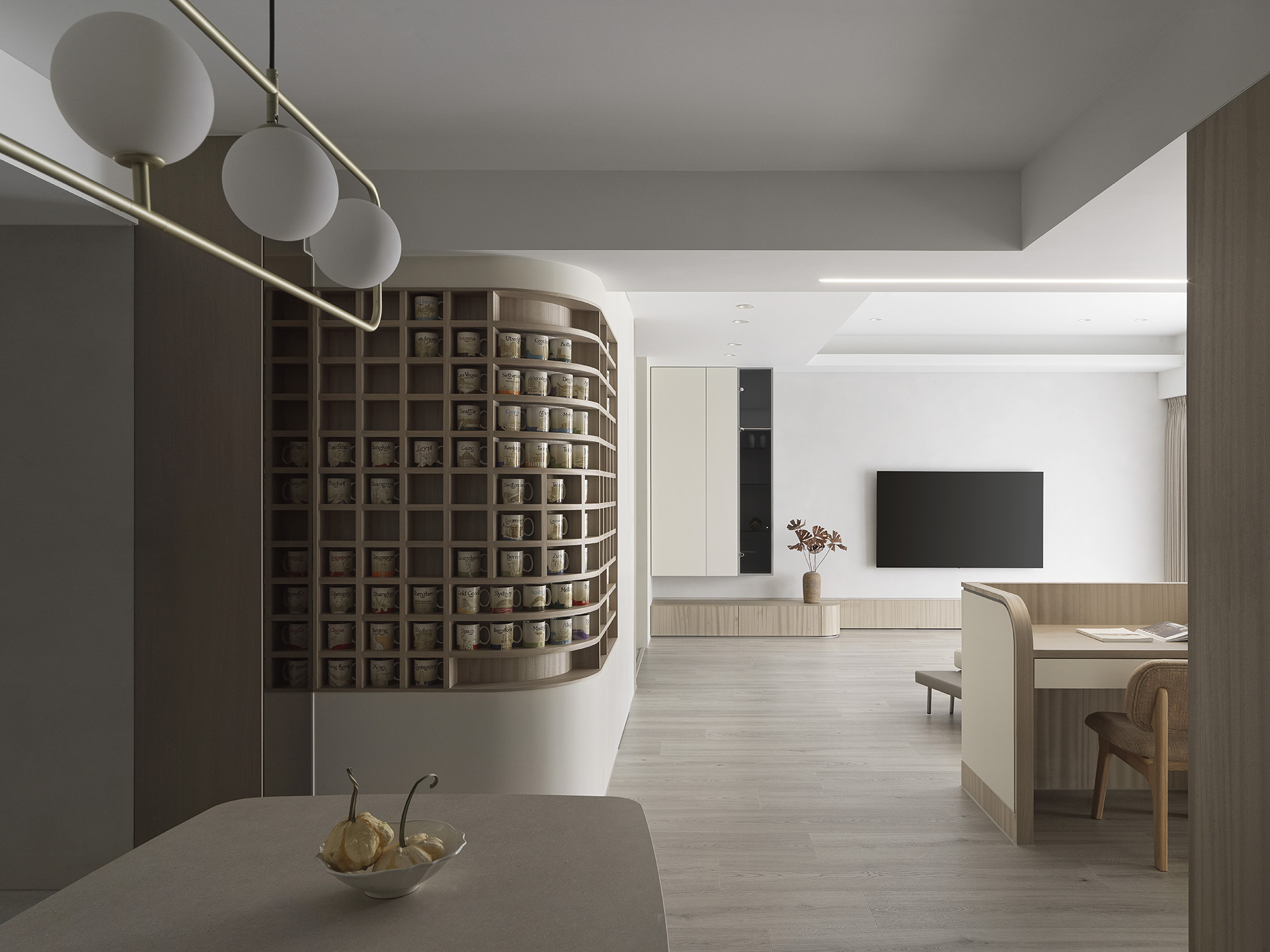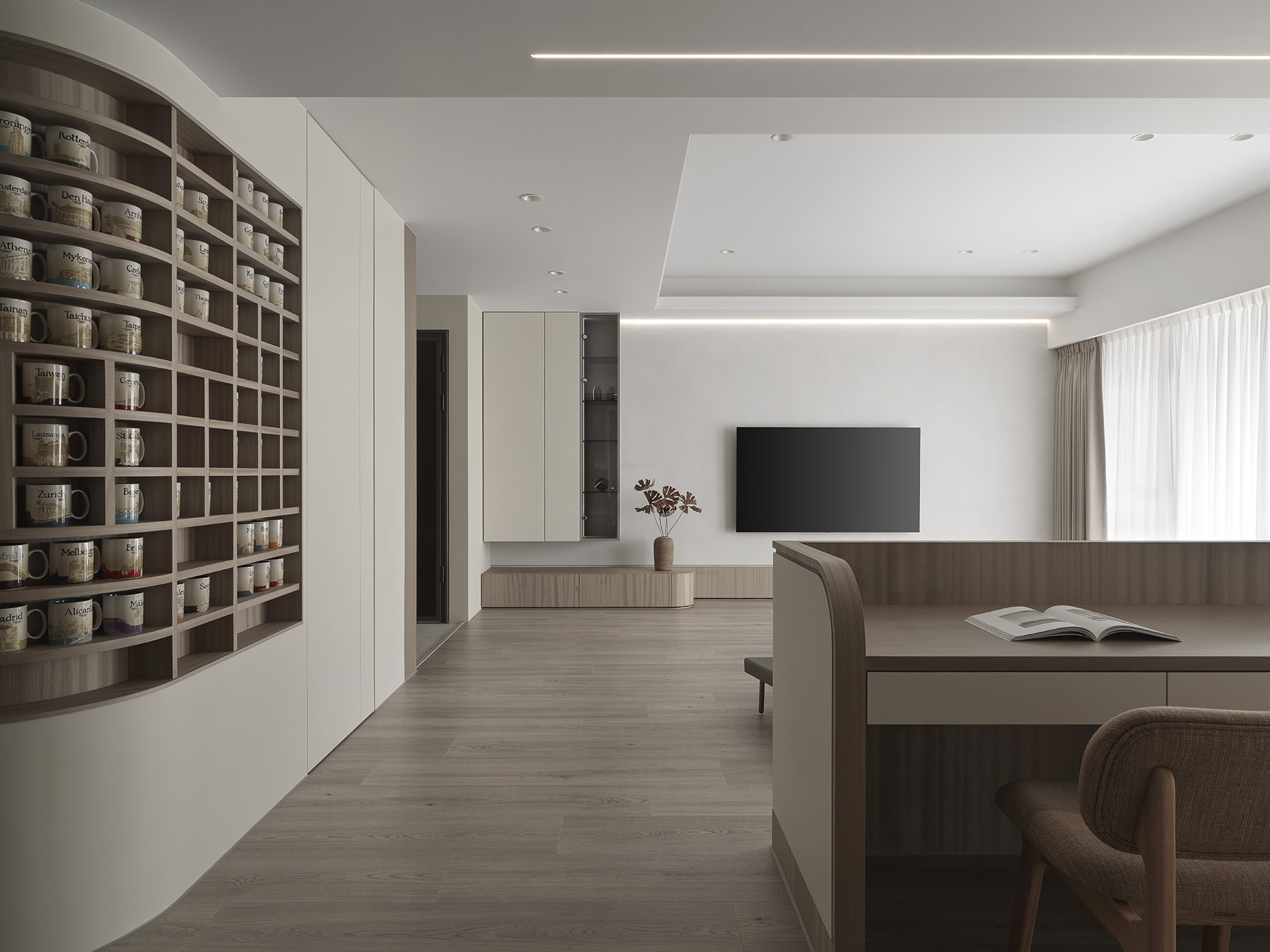 為了突顯這面世界風景圖,空間以米白與淺木色為基底,訴求乾淨溫和,只將繽紛留給這面牆。保留開闊的尺度,光帶沿著量體邊緣滑行,包含電視牆與低檯度的木平台橫向延伸、閱讀臥榻區後方的展示櫃、天花板起伏落差間,猶如在每個完成項目中畫上重點,讓空間在微光之中形成柔和的層次。