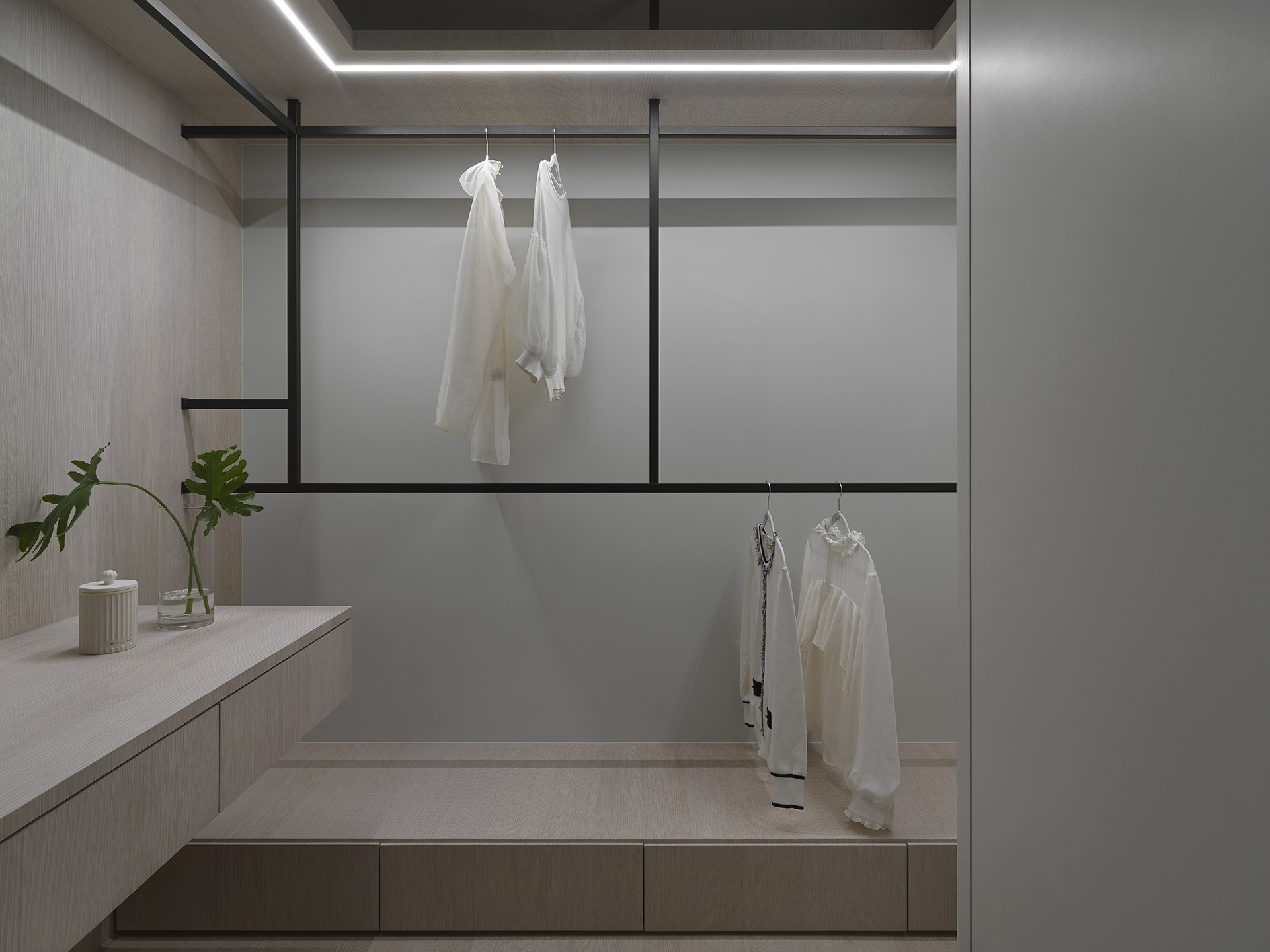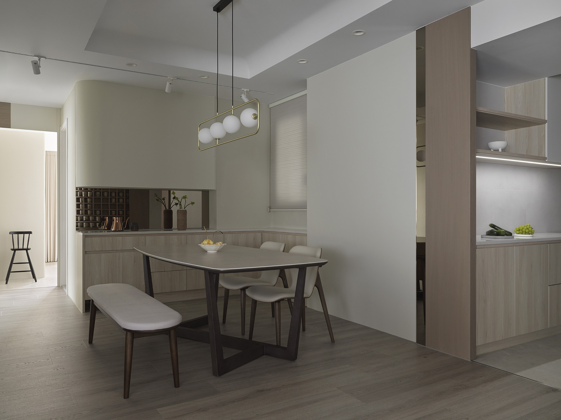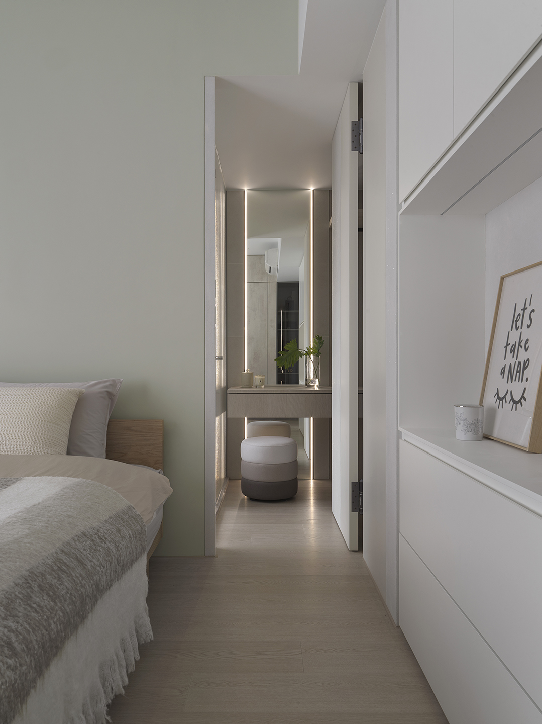 為了突顯這面世界風景圖,空間以米白與淺木色為基底,訴求乾淨溫和,只將繽紛留給這面牆。保留開闊的尺度,光帶沿著量體邊緣滑行,包含電視牆與低檯度的木平台橫向延伸、閱讀臥榻區後方的展示櫃、天花板起伏落差間,猶如在每個完成項目中畫上重點,讓空間在微光之中形成柔和的層次。