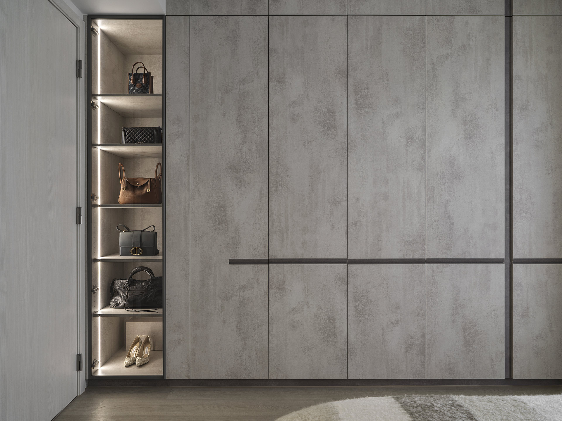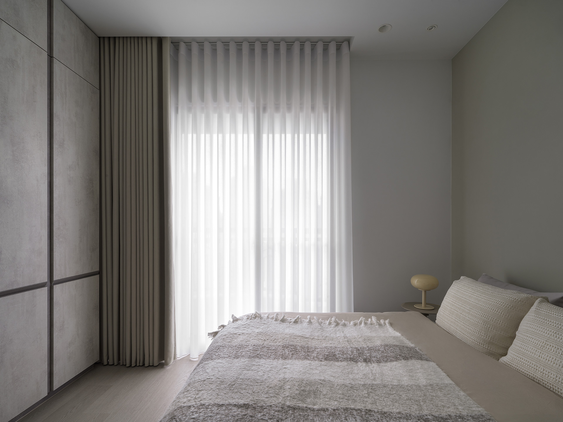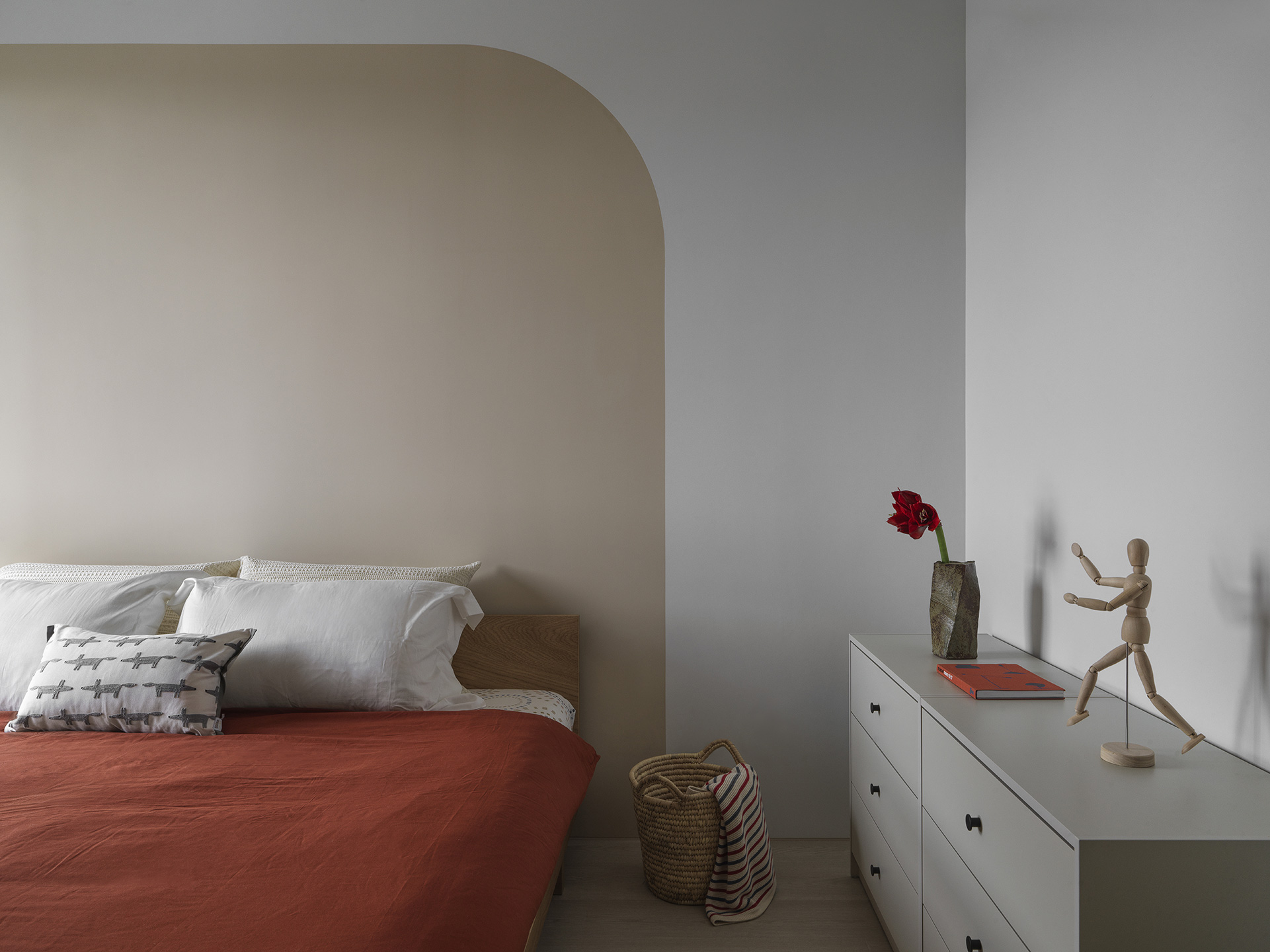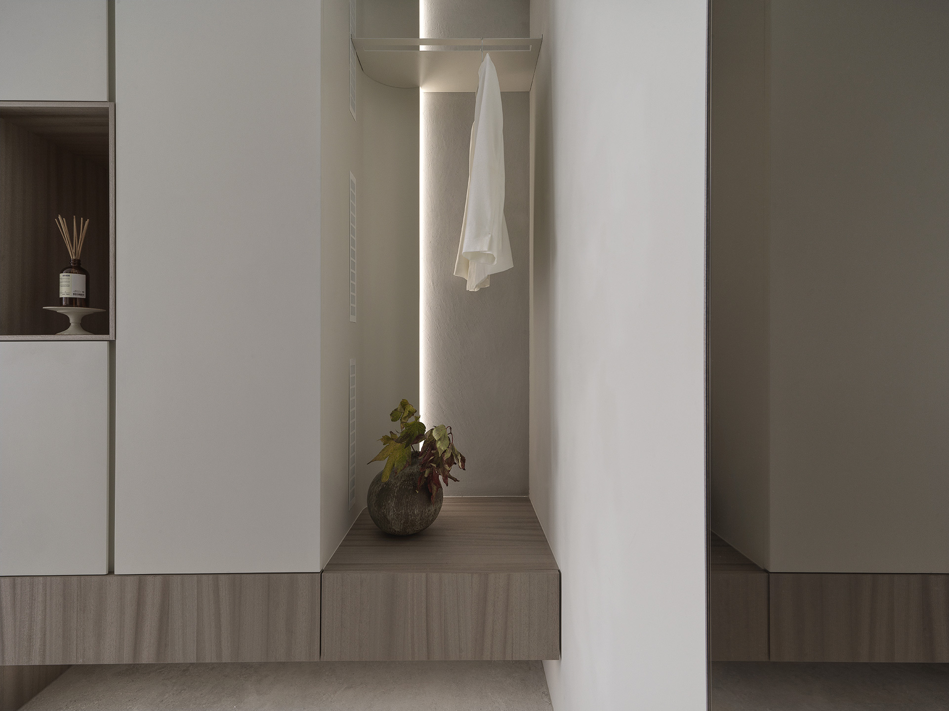 為了突顯這面世界風景圖,空間以米白與淺木色為基底,訴求乾淨溫和,只將繽紛留給這面牆。保留開闊的尺度,光帶沿著量體邊緣滑行,包含電視牆與低檯度的木平台橫向延伸、閱讀臥榻區後方的展示櫃、天花板起伏落差間,猶如在每個完成項目中畫上重點,讓空間在微光之中形成柔和的層次。